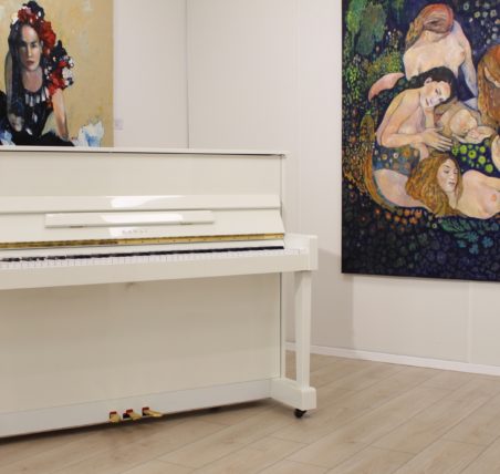 Werkstattgeprüftes Gebrauchtklavier, weiß poliert, Made in Japan.